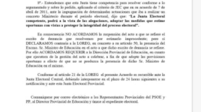 Según consta en el documento,“la visita del ministro no puede ampararse en un pretendido carácter de imprescindible para la salvaguarda del interés público o para el correcto desenvolvimiento de los servicios públicos, pues la finalidad que se pretende de promocionar la Formación Profesional puede lograrse con la presencia del ministro, pero fuera ya de la campaña electoral, y una vez celebradas las elecciones”.