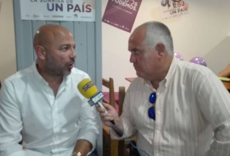 José García Molina, de Podemos, con el compañero de SER Talavera, Antonio Monje, durante una de las conexiones en la jornada electoral