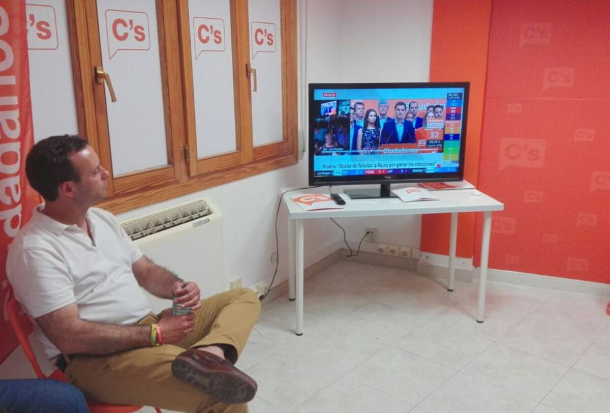 El candidato de Ciudadanos en Albacete, Onésimo Eduardo González, sigue la comparecencia de Albert Rivera