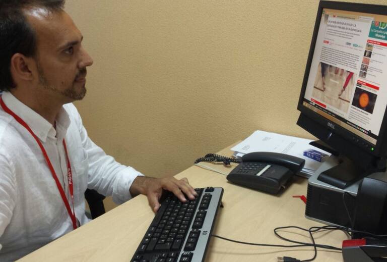 Pablo Bellido, del PSOE, consultando las encuestas tras el cierre de los colegios electorales