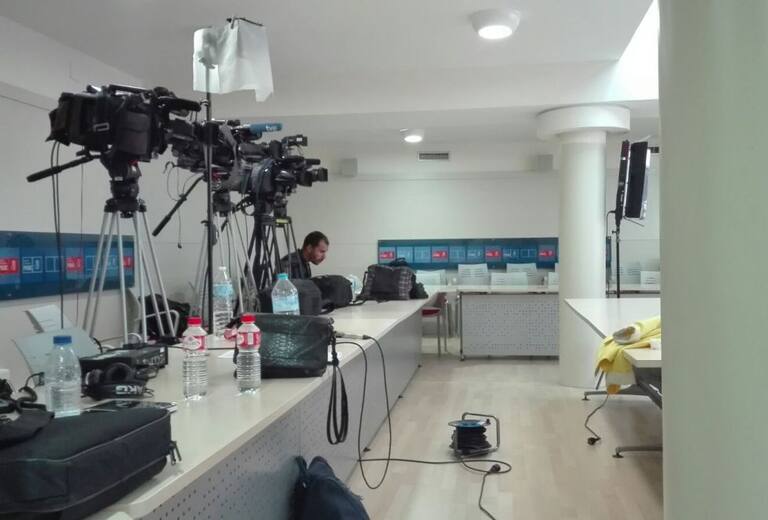Los medios de Castilla-La Mancha cubriendo la noche electoral en la sede del PSOE en Toledo