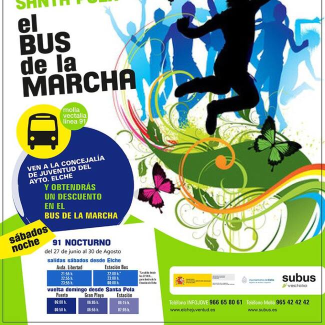 La Concejalía de Juventud, pone en marcha el Servicio del Bus de la Marcha Elche- Santa Pola durante los meses de Julio y Agosto de 2016. Este servicio comienza desde el fin de semana del 2-3 de julio, y finaliza el fin de semana 3-4 de septiembre de 2016.