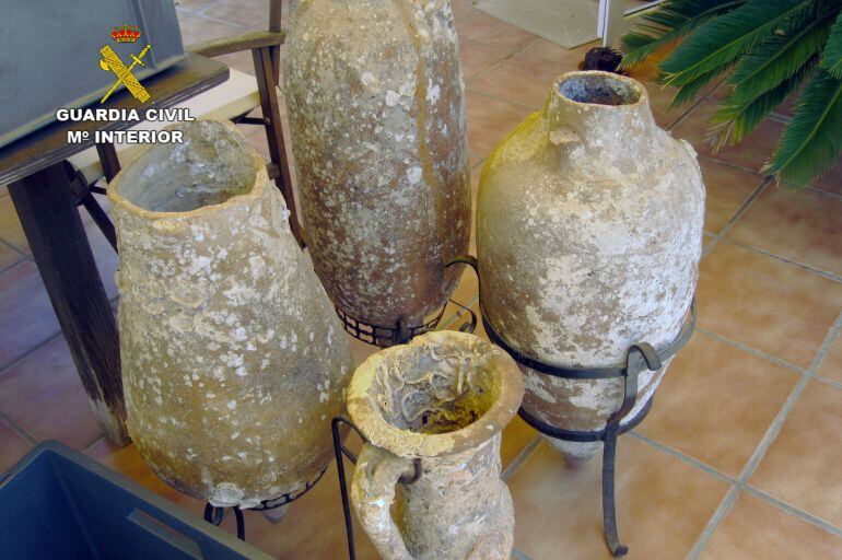 La Guardia Civil de la Región de Murcia ha culminado la operación 'Reona' con la localización y recuperación, en un domicilio de Cabo de Palos, de cuatro ánforas y un lingote de plomo de diferentes épocas romanas, que forman parte del Patrimonio Histórico Arqueológico de la Región de Murcia.