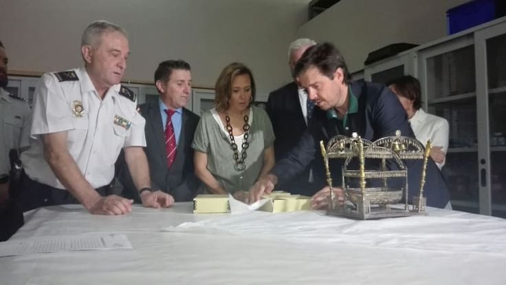 Poco después de las once de esta mañana se ponia el punto final a una larga historia, la de la cuna del Belén del monasterio de Sijena. La Policía la entregaba dentro de una caja de cartón a las autoridades aragonesas en el Museo Provincial de Zaragoza donde ahora será analizada y examinada para su conservación antes de volver al monasterio del que salió.
