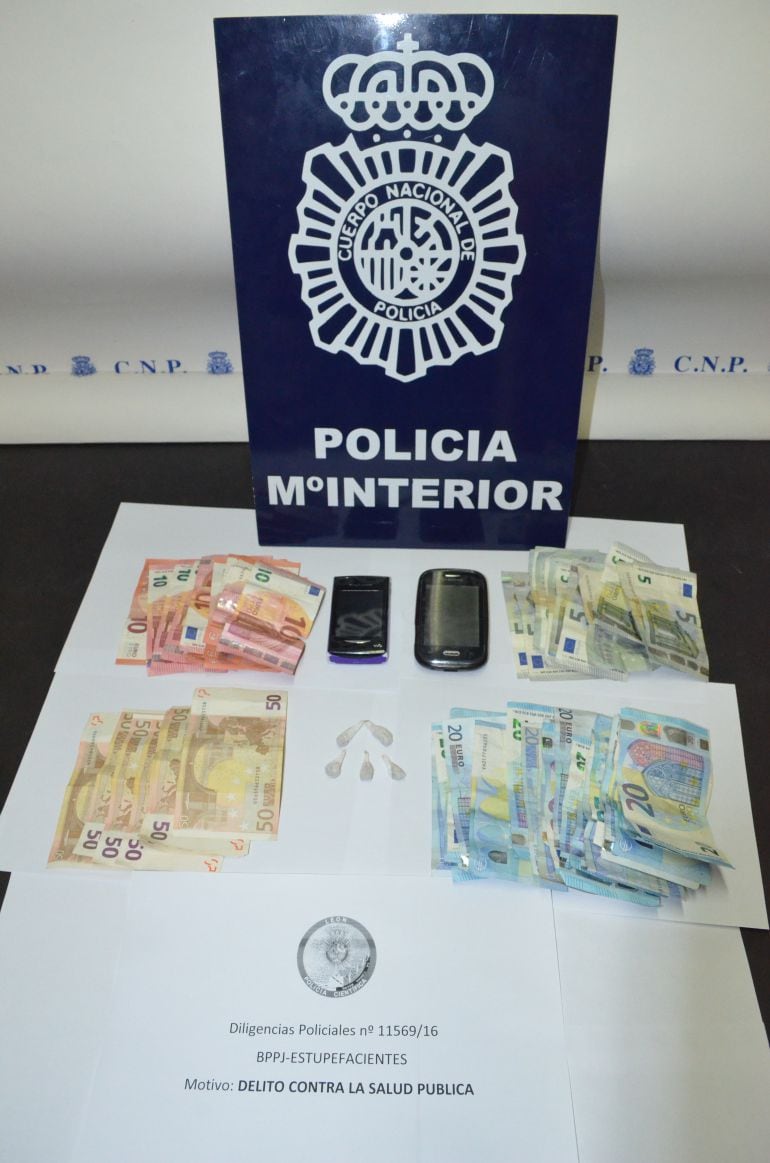 Tras la detención del joven en el barrio y el registro domiciliario practicado se incautó la sustancia estupefaciente (heroína) ya preordenada para su venta, así como mil ochenta y cinco euros fragmentados en billetes pequeños, obtenidos de esa ilícita actividad.