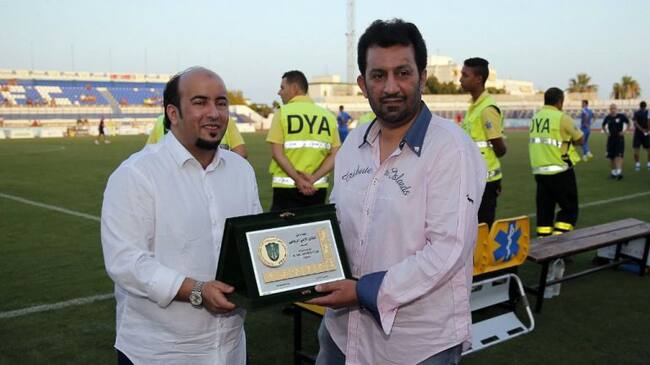 El presidente del Málaga, el jeque Al Thani, se intercambia regalos con su homólogo saudí en el municipal de Marbella / malagacf.com