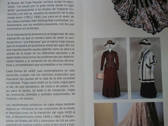 La muestra ha sido promovida desde el área de Cultura y Juventud de la Diputación Provincial de Soria que ha hecho posible que la colección Trajearte se haya trasladado desde su sede en Extremadura hasta Soria. Se trata de una de las colecciones privadas de indumentaria más importantes del país. La exposición muestra la evolución de la silueta femenina: los ajustados jubones y amplias faldas del siglo XVIII, pasando por los ligeros vestidos de la moda imperio de principios del siglo XIX y la vuelta al uso de corsés en el periodo romántico, moda que se mantuvo hasta la primera década del siglo XX. A partir de 1910 las líneas rectas insinuaron un cambio social en la mujer que finalmente acorta sus vestidos enseñando sus piernas en 1920.