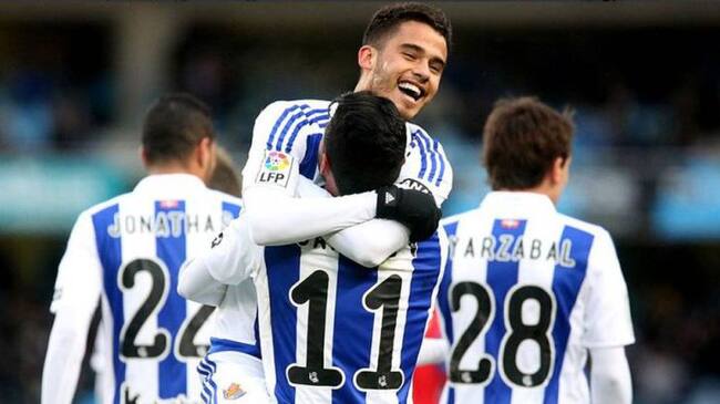 Diego Reyes celebra con Carlos Vela uno de sus dos goles con la Real la pasada temporada / Real Sociedad