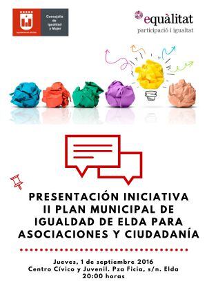Este jueves, uno de septiembre a las ocho de la tarde en el Centro Cívico y Juvenil de la plaza de La Fícia, la Concejalía de Igualdad y Mujer presenta a las asociaciones y colectivos de la ciudad, las iniciativas a seguir en la elaboración del II Plan Municipal de Igualdad de Mujeres y Hombres de Elda que estará vigente desde 2017 a 2021.