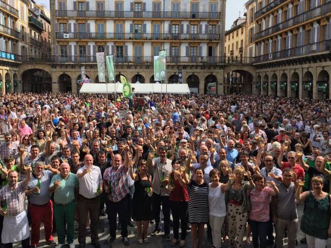 Los asistentes al XXXI Sagardo Eguna de San Sebastián celebrado este sábado en la Plaza de la Constitución, organizado por la Asociación de Sidra Natural de Gipuzkoa en colaboración del Ayuntamiento de San Sebastián, Donostia Festak, Diputación Foral de Gipuzkoa, Gobierno vasco y HAZI fundazioa, han consumido 8.000 botellas de sidra de la cosecha 2015.