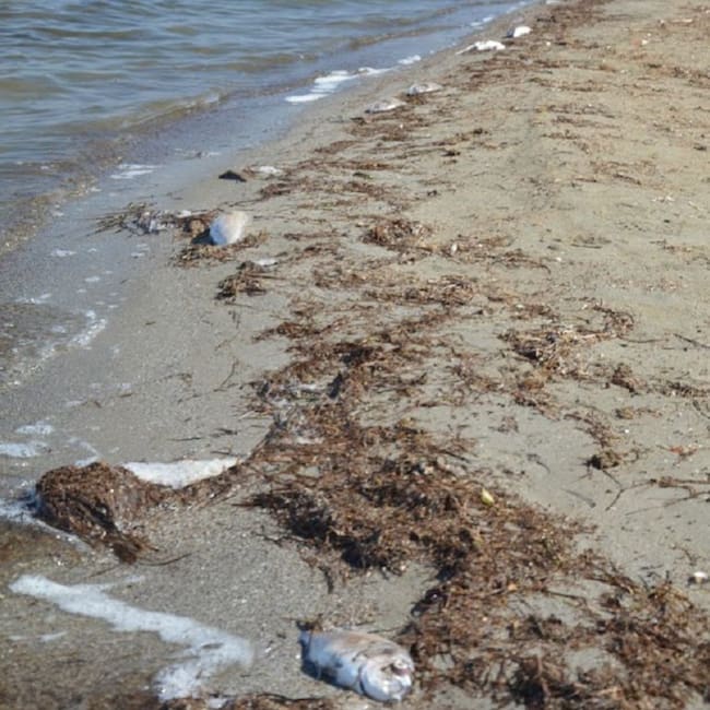 Los vecinos de La Manga se han encontrado este sábado con una desagradable sorpresa en las playas del Mar Menor al presenciar la imagen de cientos de peces muertos en la costa.