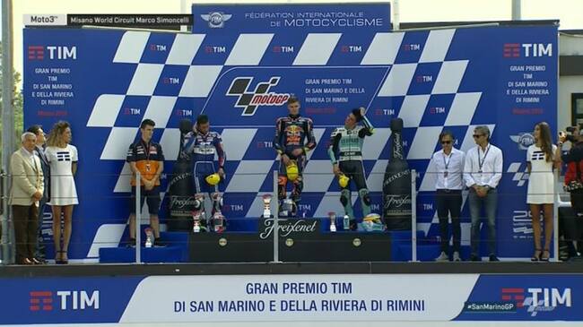 Mir fue sancionado a ceder una posición por sobrepasar el límite de la pista pero en la última curva adelantó a Bulega para hacerse un sitio en el podio.