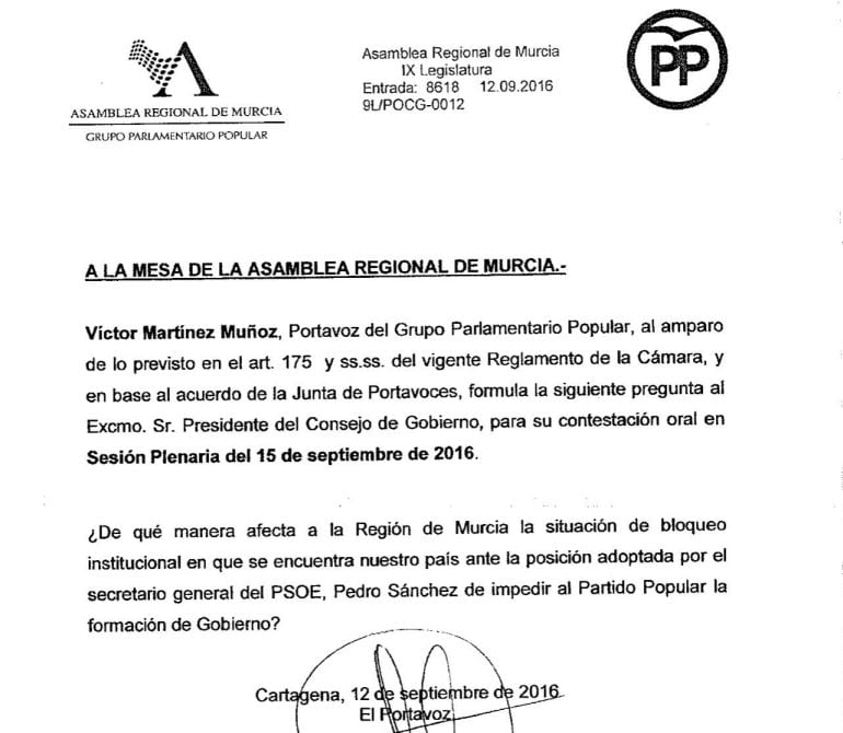 Sin embargo, según el PP aunque el lunes fue admitida a trámite con normalidad tanto por la Mesa como por la Junta de Portavoces, hoy se ha echado atrás.