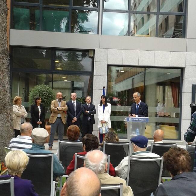 El cap de Govern amb la resta d'autoritats en la visita d'avui al centre El Cedre per celebrar amb els avis la diada de Meritxell. / SAAS
