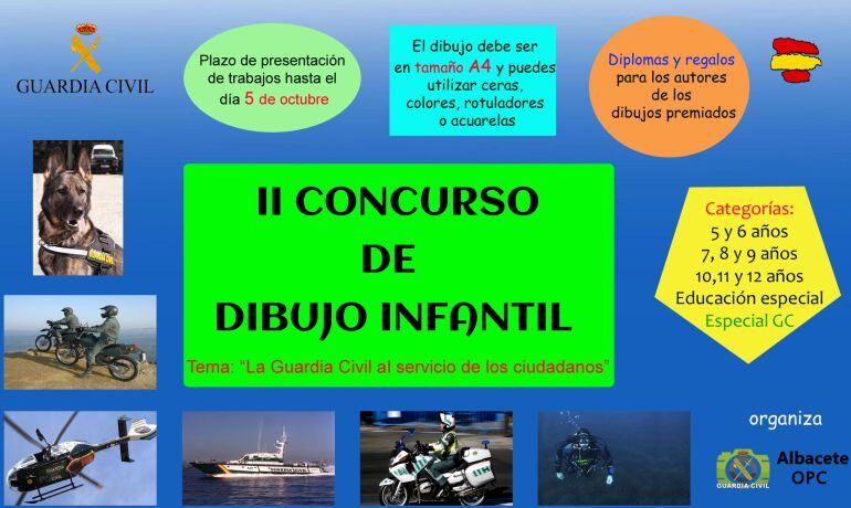 La Guardia Civil de Albacete, dentro de los distintos actos programados para conmemorar el patronazgo de la Virgen del Pilar, que se celebrará el próximo día 12 de octubre, ha convocado la 2ª edición de un concurso de dibujo infantil en el que podrán participar alumnos de los centros de Albacete y su provincia con edades comprendidas entre los 5 y los 12 años.