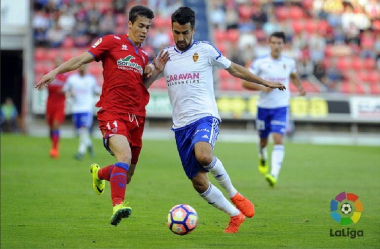 Los primeros 45 minutos estuvieron marcados por la igualdad entre ambos conjuntos y así lo reflejó el marcador. Juan Muñoz, titular por primera vez, también estrenó su casillero particular. En el minuto 38 aprovechaba un rechace del guardameta local a disparo de Ángel para hacer el primer tanto de la tarde. Pero solo hicieron falta 7 minutos para que el Numancia se recompusiera y Manu del Moral consiguiese rematar un centro mal defendido que supuso el empate a uno.