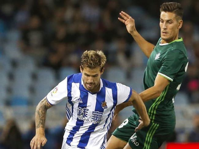 Iñigo Martínez roba un balón al delantero bético Alex Alegría el pasado viernes / JAVIER ETXEZARRETA (EFE)