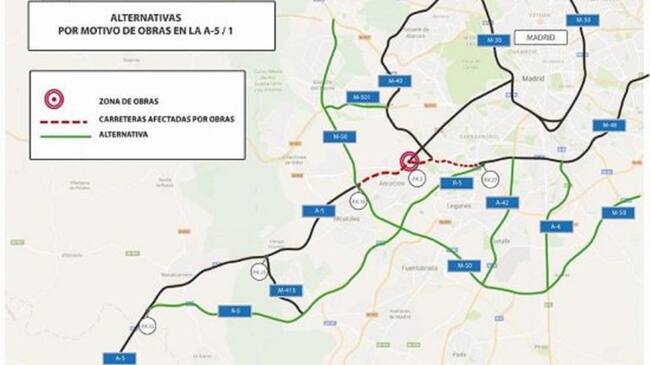 La Dirección General de Tráfico recomienda itinerarios alternativos. Uno de ellos es la carretera M-50, en su arco sur, para los usuarios procedentes o con destino a las poblaciones toledanas de Talavera de la Reina y madrileñas de Navalcarnero, Móstoles y Alcorcón. Pueden coger en el kilómetro 18 de la A-5 la carretera M-50 en arco sur y acceder a las autovías A-42, A-4, A-3 y A-2.