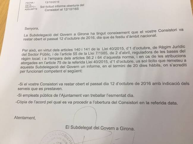 Són 9 ajuntaments de les comarques de Girona (4 de la CUP, 4 d'Esquerra i un de CiU) els que van obrir i ara han rebut la carta del subdelegat del govern espanyol, Juan Manel Sanchez Bustamante. En aquesta carta, enviada el dia 13, el subdelegat demana que en un termini de 20 dies hàbils li enviïn un informe on aclareixin “si el consistori va restar obert el passat 12 d’octubre amb indicació dels serveis que es prestaven, si empleats públics de l’Ajuntament van treballar l’esmentat dia i còpia de l’acord pel qual es va procedir a l’obertura del consistori en la referida data”.