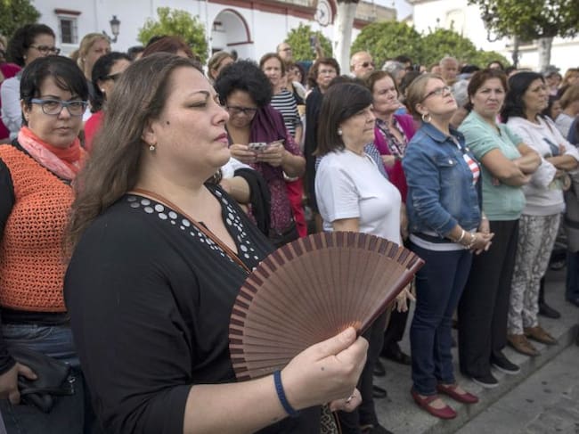 GRA195. OLIVARES (SEVILLA) 17/10/2016.- Varias mujeres muestran su pesar durante el minuto de silencio hoy a mediodía ante el Ayuntamiento de Olivares (Sevilla) en repulsa por el asesinato de Estefany González, madre de dos niños de tres y cinco años, que / Julio Muñoz (EFE)