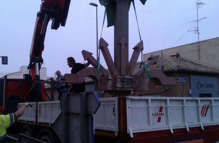 El monolito con el yugo y las flechas que había en la plaza de la Iglesia de La Aljorra ha sido retirado por funcionarios municipales en cumplimiento de la Ley 52/2007 de 26 de diciembre de la Memoria Histórica, por la que se reconocen y amplían derechos y se establecen medidas en favor de quienes padecieron persecución o violencia durante la guerra civil y la dictadura.