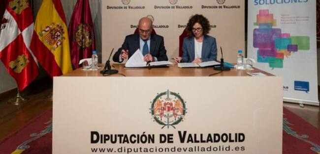 El presidente de la Diputación de Valladolid, Jesús Julio Carnero, y la presidenta de la Asociación Proyecto Mediación, Belén Martínez de Salinas, han firmado el convenio de colaboración entre ambas instituciones que va a permitir desarrollar la primera fase del Programa de Mediación Comunitaria en la provincia.