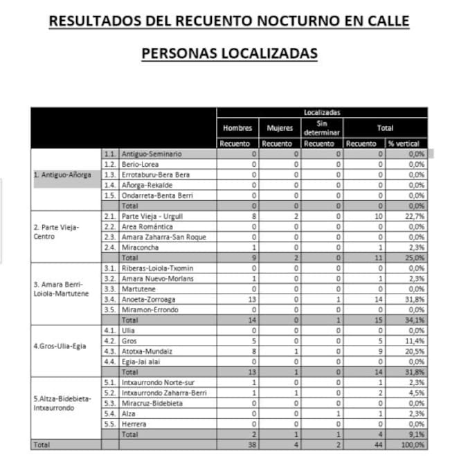 De estas 44 personas, 38 son hombres y por zonas, los alrededores del estadio de Anoeta en Amara, en la Parte Vieja la subida a Urgull y la zona de Atotxa-Mundaiz son los lugares donde más se concentran.
