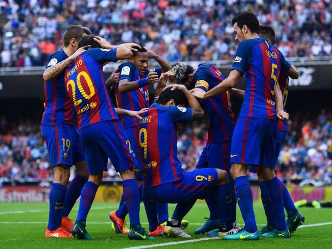 VALENCIA, SPAIN - OCTOBER 22: FC Barcelona are hit by objects thrown from the seats after Lionel Messi of FC Barcelona scores his team's third goal from the penalty spot during the La Liga match between Valencia CF and FC Barcelona at Mestalla stadium on / David Ramos (Getty Images)
