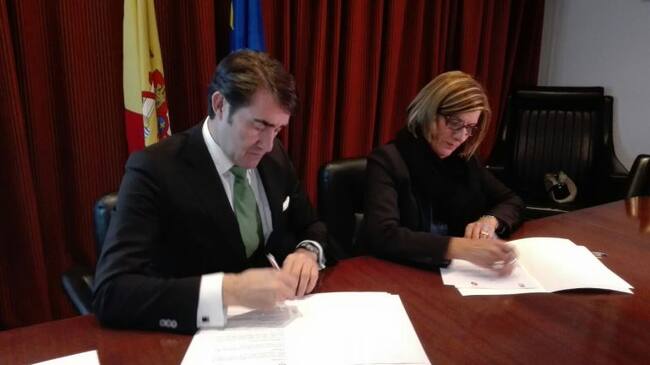 El consejero de Fomento, Juan Carlos Suárez Quiñones y la alcaldesa de Fabero, Paz Martínez Ramón firman el convenio / Radio Bierzo