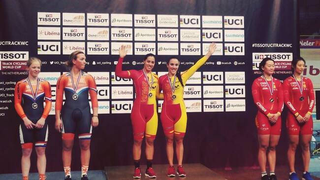 Tania Calvo y Helena Casas en lo más alto del podio de Apeldoorn en Velocidad por equipos. / RFEC