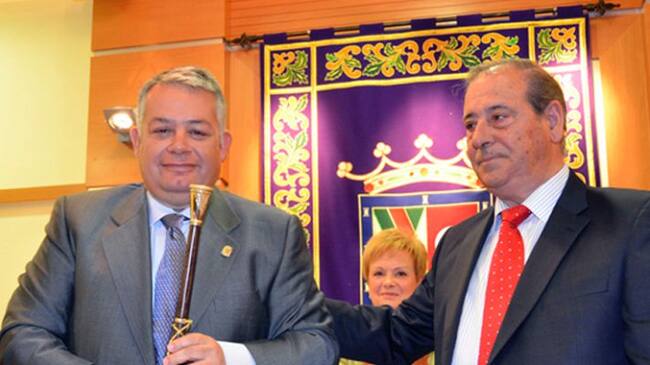 Miguel Ángel Santamaría recibiendo el bastón de alcalde de José María de Federico, ambos imputados en el caso de las licencias irregulares / Ayuntamiento de Colmenar Viejo