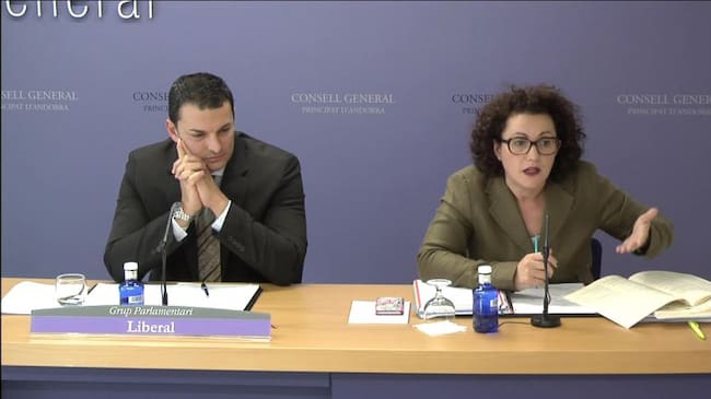 Els consellers liberals Judith Pallarés i Jordi Gallardo presentant les esmenes a la totalitat a les lleis dels cossos especials. / C.G.