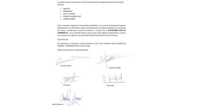 Carta que han firmado los 5 secretarios generales de las agrupaciones del PSPV a la que ha tenido acceso Radio Valencia / CADENA SER