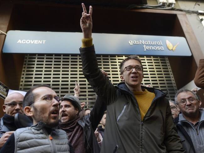El secretario político de Podemos, Íñigo Errejón, y el secretario de Organización y líder del partido en Aragón, Pablo Echenique, durante su participación hoy en una concentración contra la pobreza energética ante las oficinas de Gas Natural de Zaragoza / Toni Galán (EFE)