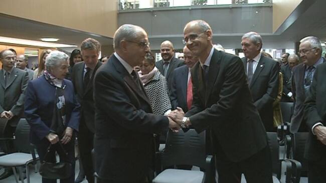 El cap del Govern, Antoni Martí, amic personal d'Estanislau Sangrà, saluda l'exsíndic general en l'acte d'homenatge organitzat per l'AESCO / RTVA