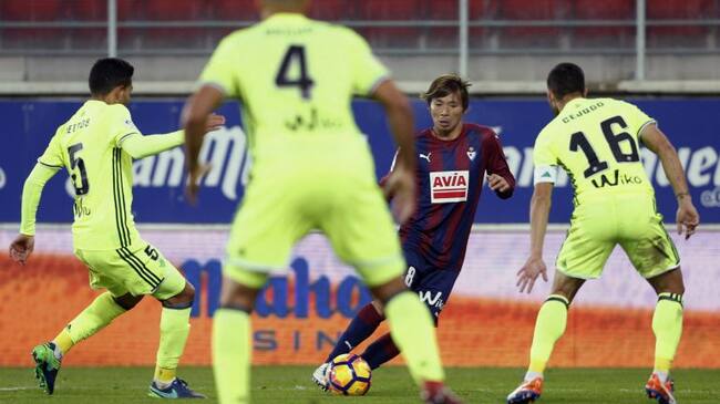 GRA384. EIBAR (GIPUZKOA).- El centrocampista japonés del Eibar, Takashi Inui (c) lucha por el balón con el centrocampista brasileño Petros Matheus (i) y el delantero Cejudo (d) del Betis durante el partido de la decimotercera jornada de Liga que disputan / Juan Herrero (EFE)