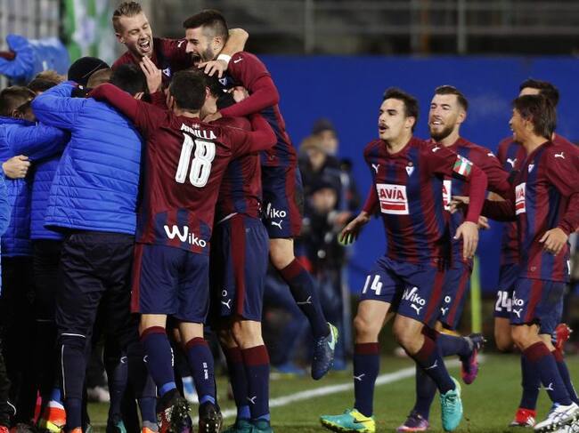 Los jugadores del Eibar celebran el golazo de Pedro León que abría el marcador / Juan Herrero (EFE)