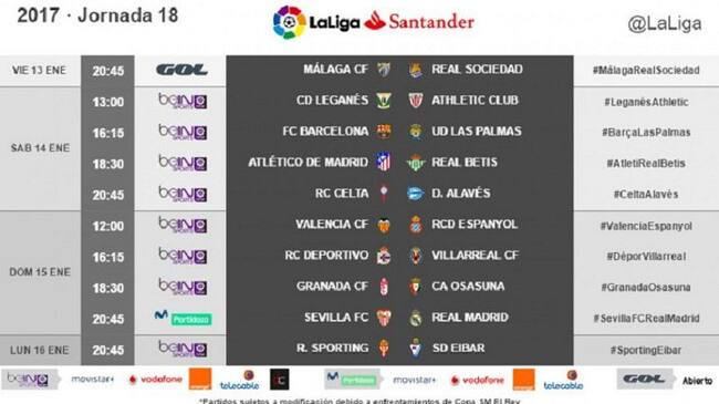 Ya se conocen los horarios de la jornada 18 de Liga a disputar entre el viernes 13 y el lunes 16 de enero. El plato fuerte de esa jornada será el Sevilla-Real Madrid, que se disputará el domingo, 15 de enero, a las 20:45 en el Sánchez Pizjuán.