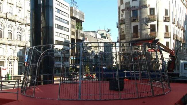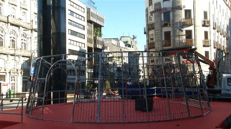 El gran árbol de navidad que se situará como todos los años en la Porta do Sol ya está prácticamente terminado. Estos días se han estado colocando la base y los cilindros que servirán de esqueleto para el árbol. Mañana se colocará el resto de soportes y la gran estrella blanca que iluminará su cúspide.