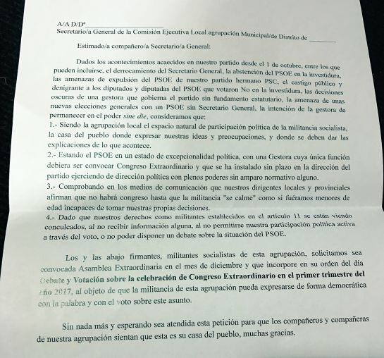 En esta asamblea se ha repartido, entre los asistentes, un escrito donde se pide su firma para pedir la celebración de ese congreso extraordinario, urgente y con primarias. La idea es que este escrito se difunda entre las diferentes agrupaciones de la provincia.