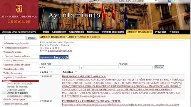 CCOO denuncia una oferta de empleo “discriminatoria y sexista” publicada en la web del Ayuntamiento de Cuenca que ha sido ya desactivada. En ella se buscaba a un matrimonio para una finca agrícola, con unas determinadas edades y pidiendo diferentes requisitos para ocupar el puesto en función del sexo.