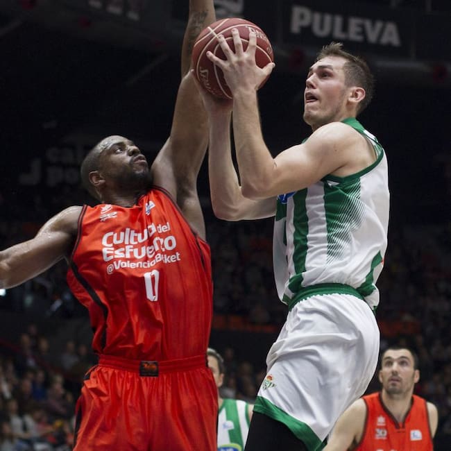 GRA160. VALENCIA, El base serbio del Real Betis Energía Plus, Nikola Radicevic (d), intenta el lanzamiento ante el alero georgiano del Valencia Basket, Will Thomas (i), durante el partido correspondiente a la décima jornada de la Liga ACB que los dos equi / Miguel Ángel Polo (EFE)