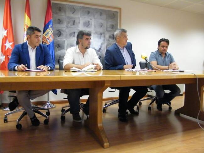De izquierda a derecha: Roberto Sánchez (PSOE), Gabriel Ortega (Ganar Móstoles), David Lucas (Alcalde de Móstoles) y Eduardo Gutiérrez (IUCM-LV). / Ganar Móstoles