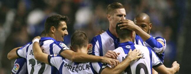 Los jugadores del Deportivo celebran el gol marcado en propia puerta por el defensa Íñigo Martínez de la Real Sociedad- / Cabalar (EFE)