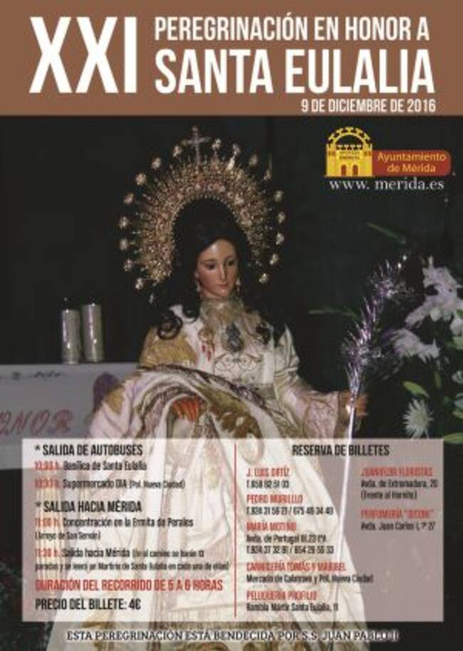A partir de las 11:30H de este viernes comienza la XXI edición de la peregrinación en honor de la Mártir desde la Ermita de Perales en Arroyo de San Serván hasta Mérida, en un recorrido a pie con una duración estimada de 5 a 6 horas. Recordar a las personas que vayan a realizar esta marcha van a salir autobuses a las 10 hacia la Ermita, organizado por la Asociación de Peregrinos de la Mártir Santa Eulalia.