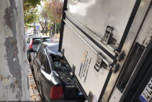 Un camión vuelca en Parque Sur y causa daños en varios vehículos