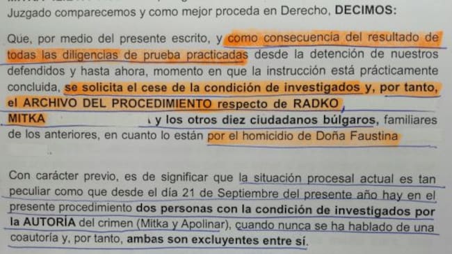 Pues bien, como consecuencia del resultado de todas las diligencias practicadas desde el asesinato, los abogados que defienden a Mitka y a Radko han solicitado el cese de la condición de investigados de sus clientes y por tanto el archivo del procedimiento respecto a ellos y a los otros 10 ciudadanos búlgaros por el homicidio de Faustina.