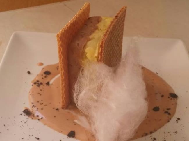 El corte. Tapa ganadora dle último concurso de Tapeando con turrón. Es trampantojo de pastel de carrillada y patata con crema de turrón a la piedra.