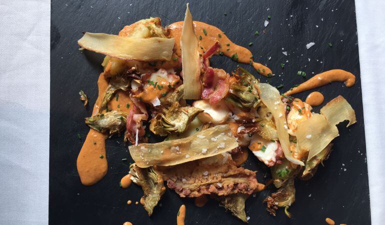 Pop roquer amb trinxat de patata, cansalada ibèrica i romesquet de carxofes