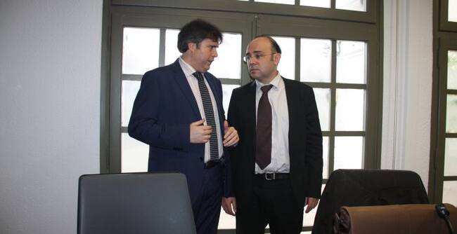 Pere Vila (CiU) i Francesc Guisset (PSC) parlant a l'Ajuntament de Llançà. / ACN